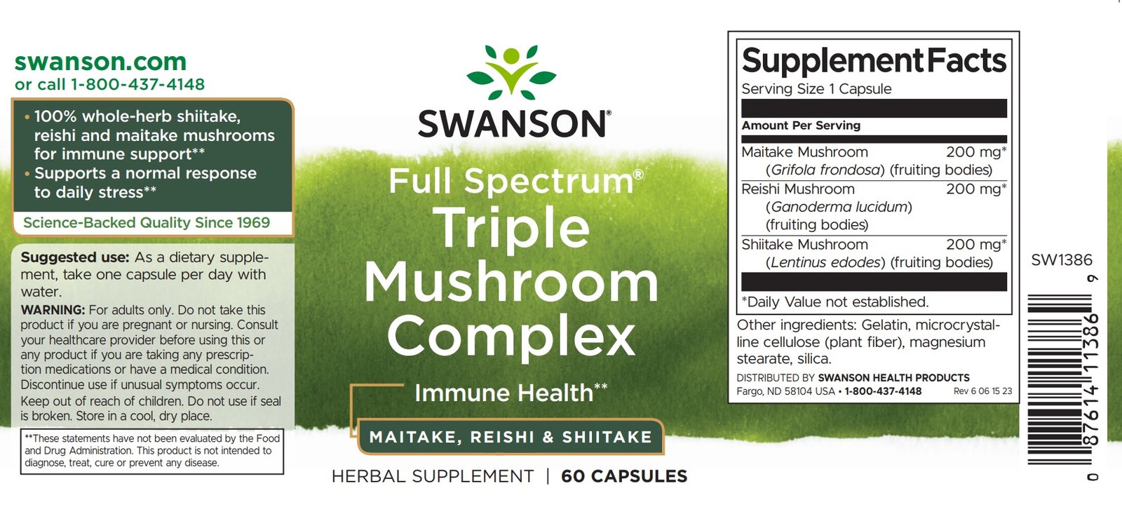 Like the other herbals in the Swanson Premium Full Spectrum line, our Triple Mushroom Complex dietary supplement is a 100% pure traditional herbal formula. Nothing fancy, just pure, high-quality, natural whole-herb Shiitake, Reishi and Maitake mushrooms at an affordable price…something you expect from Swanson Health Products. It is sourced from its native location, tested for purity and safety and manufactured under the strictest quality controls. Make the most of your immune system support efforts with Full Spectrum Triple Mushroom Complex.