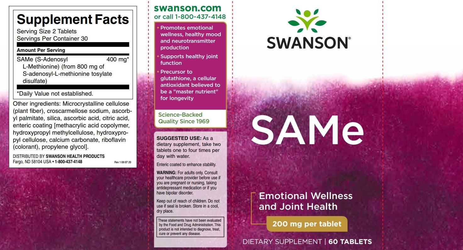 Get effective nutritional support for emotional wellness and joint mobility with Swanson SAMe. A dietary supplement without equal, SAMe (s-adenosyl methionine) is a double- duty nutrient that promotes healthy joint function and vital neurotransmitter production. Each convenient tablet delivers 200 mg of SAMe support. Recently, SAMe has been acknowledged as a powerful precursor to glutathione, a potent cellular antioxidant believed to be a « master nutrient » for longevity. Delivered in enteric-coated tablets for maximum absorption.