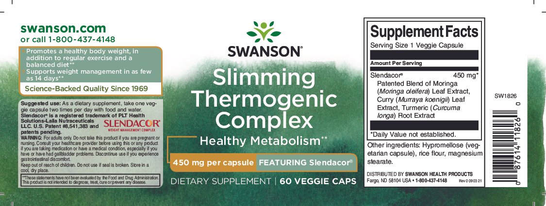 Three traditional herbs join forces to combat weight in Slendacor®, the unique, patented ingredient in Swanson Slimming Thermogenic Complex. Award-winning Slendacor has been clinically studied for its potential to inhibit fat accumulation and promote the breakdown of fat in adipose cells. In combination with a healthy diet and regular exercise, Swanson Slimming Thermogenic Complex can start you on the road to long-term weight management success with results in as few as 14 days. Slendacor is a novel combination of standardized extracts of turmeric (Curcuma longa), moringa (Moringa oleifera) and curry leaf (Murraya koenigii), three herbs with a long history of culinary use. Emerging research suggests they may work better together to promote a healthy body weight without loss of lean muscle. Moringa in particular has been shown to help achieve a healthier waist-to-hip ratio and healthier lipid levels for both men and women. Swanson Slimming Thermogenic Complex featuring Slendacor may also support healthy blood glucose levels.