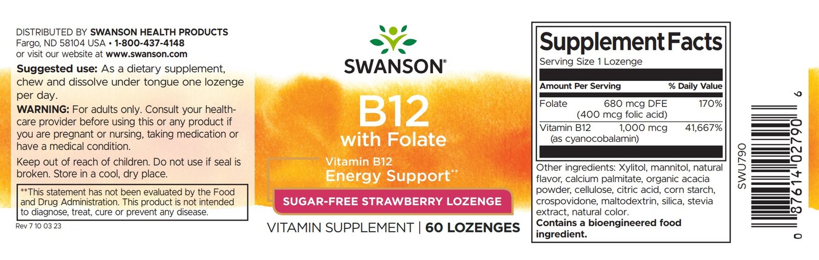 Swanson Vitamin B12 with Folate formula dissolves quickly with a soft mouthfeel and a subtle natural strawberry flavor. Each tablet delivers 1,000 mcg of energizing B12 as cyanocobalamin plus folate for balanced nutrition. Sugar free, sweetened with rebaudioside A (Reb A) from stevia. Vitamin B12 supports energy metabolism and red blood cell formation. It is also essential for a healthy nervous system. Best known for its role in a healthy pregnancy, folate supports cardiovascular wellness while also improving the absorption of B12.