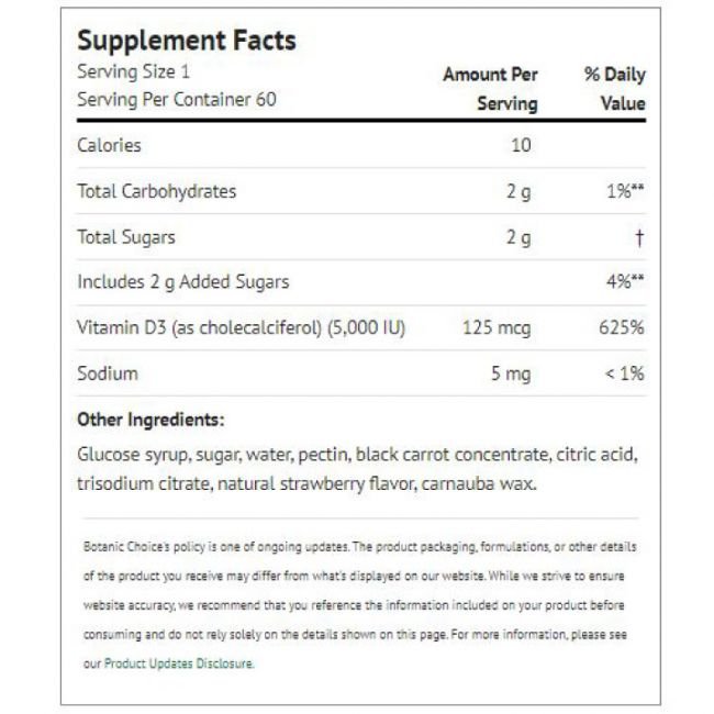 Known as cholecalciferol, your body actually makes Vitamin D3, unlike Vitamin D2, which your body does not make. D3 is formed naturally within about 10 to 15 minutes of sun exposure with no sunscreen. Make sure you’re getting enough of the « sunshine vitamin » with these tasty gummies.